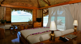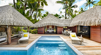 Suites feature a silhouette view of Bora Bora, the Coral Garden, and the chain of motu islets, and offer direct access to the lagoon.