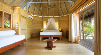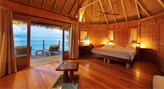 Bungalows are located directly on the beach and feature a lagoon view. Additional amenities include an indoor/outdoor bathroom overlooking a small private garden.