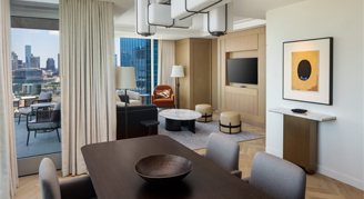 Indulge in this 896 square-foot one-bedroom corner suite. The living room features a spacious seating area with a dining area for up to four guests. This exceptional suite is ideal for special occasions and offers a balcony overlooking the green roof. The spacious bedroom has a king bed with Frette bedding and a bathroom featuring Byredo amenities, a walk-in shower with rain shower head, double vanities and a separate soaking tub.