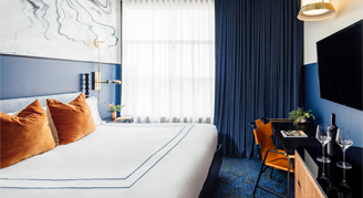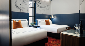 Surround yourself with art deco-inspired furnishings in these rooms featuring two queen beds and a desk. The wire-brushed, hand-turned spindle oak headboards with suede upholstery and velvet touches to soften the guest experience.