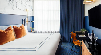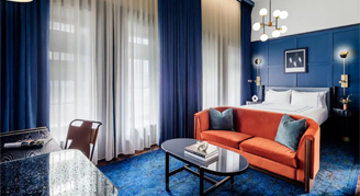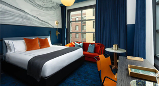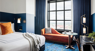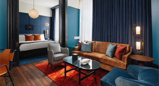 Located on one of the higher floors, these rooms feature a plush king bed, desk, art deco-inspired furnishings, and stunning 13-foot-high, loft-like ceilings. The wire-brushed, hand-turned spindle oak headboard with suede upholstery and a velvet chaise softens the guest experience.