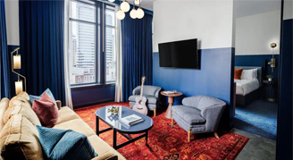 Within walking distance of Printer's Alley, these suites features a king bed, 13-foot-high ceilings, art deco-inspired furnishings, detailed wood accent walls, hardwood floors, a divider wall, and pocket doors. The wire-brushed, hand-turned spindle oak headboard with suede upholstery and a velvet sofa softens the guest experience.