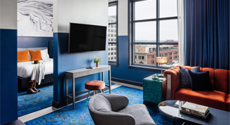 Overlooking Nashville’s historic 4th Avenue, these suites feature a queen bed, art deco-inspired furnishings, a desk, and 15-foot-high ceilings. The wire-brushed, hand-turned spindle oak headboard with suede upholstery and a velvet sofa soften the guest experience.