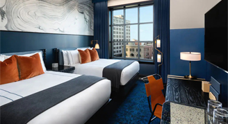 Steps away from historic Printer’s Alley, these rooms features two queen beds, a desk, and art deco-inspired furnishings. The wire-brushed, hand-turned spindle oak headboards with suede upholstery and velvet touches to soften the guest experience.