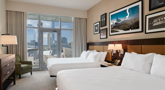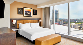 Take in breathtaking panoramic views of Music City from the living room of this corner suite. Stretch out in this two-room suite featuring a private bedroom with one king bed. Furnishings include two 55-inch HDTVs, a pull-out sofa bed, wet bar area with mini-fridge, microwave, coffee maker, steamer and a well-lit dining/work table.