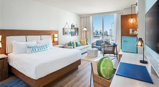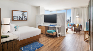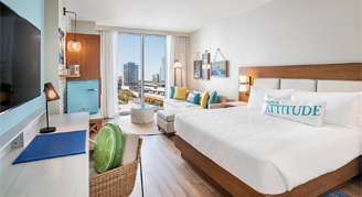 This fresh and comfortable retreat with contemporary furnishings and a soothing sand, sea and sky color palette provides the perfect Margaritaville right here in Music City. Enjoy a large king bed dressed in custom, luxurious, all-white linens and premium bedding. The room’s common area offers a welcoming lounge area complete with a sofa bed, perfect for extra company.