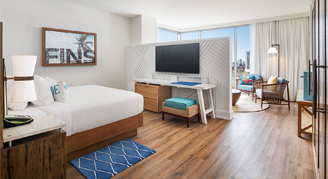 This accessible retreat is set up to allow for accessibility and comfort. Contemporary furnishings and a soothing sand, sea and sky color palette create a relaxing Margaritaville right here in Music City. Enjoy a large king bed dressed in custom, luxurious, all-white linens and premium bedding. The room’s common area offers a welcoming lounge area complete with a sofa bed, perfect for extra company.