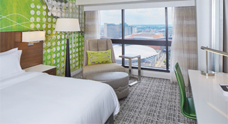 Rooms feature an elevated city view and a king bed with a backlit vanity, full-length mirror and a 55-inch Smart TV.