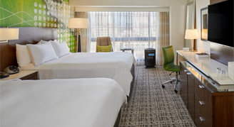 Rooms feature an elevated city view and two queen beds with a backlit vanity, full-length mirror and a 55-inch Smart TV.