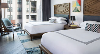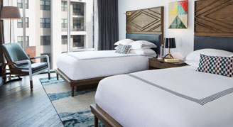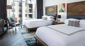 The energy of Music City's posh neighborhood, The Gulch, thrives just outside your room. Relax in comfort with two double beds, mid-century modern furnishings, a sitting chair, hardwood floors, and a rainfall shower.