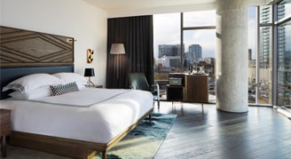 Whether traveling to downtown Nashville for leisure or business, this accessible room offers comfort and style. Floor-to-ceiling windows let in refreshing daylight while hardwood floors, a curated honor bar, sitting chair, and an accessible roll-in shower round out the rest of the residential amenities.
