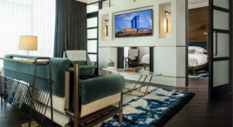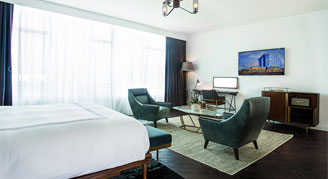 Start your day in this one king suite featuring floor-to-ceiling windows, hardwood floors and elegant furnishings throughout. Take a seat in one of the mid-century modern chairs by the marble coffee table and plan adventurous pursuits amid the Music City. An oversized desk and roll-in shower complete this accessible suite.