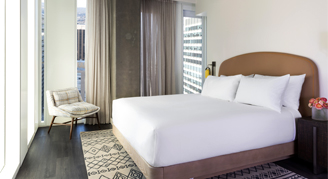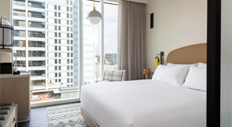 See and feel the eclectic Austin vibes from the city inside the fashion-forward rooms designed to be your peaceful escape after an exciting day exploring everything the area has to offer. Enjoy the natural light from the floor-to-ceiling windows and a plush king bed.