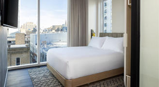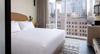 Keep a close eye on the excitement of the neighborhood's culture, shopping and dining from the spectacular floor-to-ceiling windows while you enjoy the cozy room's king bed and modern bathroom with a walk-in shower.