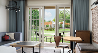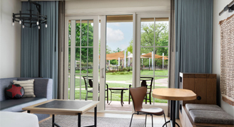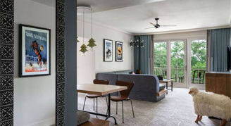 The luxurious patio suites are all located on the first floor and are 1,345 square feet. You'll enjoy a stunning private patio and a parlor that is furnished with multiple plush lounge areas, a queen Murphy bed, a bathroom, and a cozy library with a bar. The living room connects to a separate king bedroom with a full-size sleeper sofa and a second bathroom.