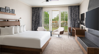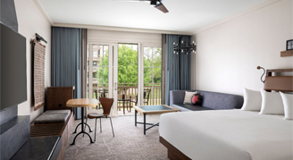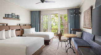 Relax and recharge, or keep the festivities going, in this 770-square-foot suite on the second or third floor featuring a furnished balcony. Ideal for smaller families and groups, this suite offers one king bedroom and a living area with a dining table, seating, and a queen sleeper sofa.