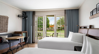 Perfect for a family getaway near Austin, this 2,600-square-foot private cottage offers views of the resort pond and golf course as well as two bedrooms, a living room with a fireplace, a full-size sleeper sofa, and a dining room. A fully equipped kitchen includes a refrigerator, oven, stove, dishwasher, microwave, and Nespresso® coffee maker. The king bedroom and double queen bedroom each feature a separate seating area, bathroom, and furnished outdoor patio.