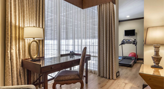 Enjoy a "home away from home" feel with a residential layout perfect for extended stays and gatherings, featuring a desk, separate living room, treadmill, yoga mat, resistance bands, free weights, and interior atrium views.