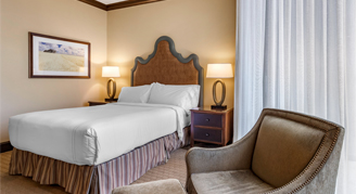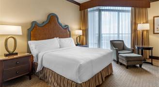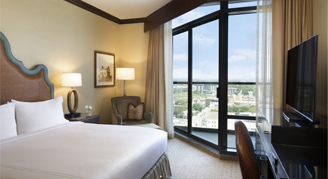 The Texas Traditional Room offers one king or one queen bed on the 15th floor or higher with city or interior atrium views, featuring a 55" HDTV with casting technology and a seating area with a lounge chair. The décor incorporates a traditional Texas décor with dark wood, earth-colored accents, and crown molding to create a warm and inviting retreat. The guest bathroom showcases either a walk-in shower or bathtub with Nest bath amenities.