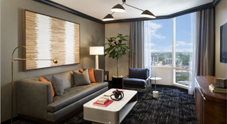 Step into a mid-century modern escape with stunning Austin skyline views. This suite features a separate living room for entertaining or relaxation and one king bedroom. The bathroom showcases a walk-in shower or bathtub, an extravagant quartz vanity with an illuminated mirror, and Nest bath amenities. Located on the Premier Club floor, enjoy exclusive keycard access to daily culinary presentations and a dedicated Guest Experience planner.