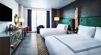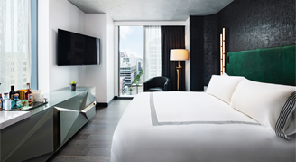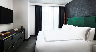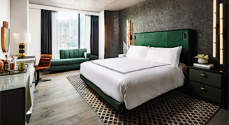 Admire views of downtown from a spacious room located on floors 9 through 14. With floor-to-ceiling windows, plush green seating, soft gray rugs, black-and-white terrazzo floors, and sculptural lighting — this is exactly where you can unwind in style.