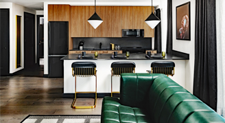 The 16th floor Studio Residence features breathtaking downtown Austin views through floor-to-ceiling windows as well as a full kitchen, a spacious living area, and stylish furnishings — all enhanced by impressive architectural angles, plush green seating, soft grey rugs, and black-and-white terrazzo floors.
