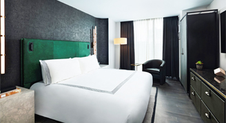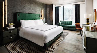 Floor-to-ceiling windows along two walls draw in light across this spacious corner room. Lounge on the king bed or plush green seating and revel in energizing city views while savoring in-room dining menu options curated by acclaimed restaurateur Mashama Bailey. Impressive architectural angles, soft gray rugs and black-and-white terrazzo floors highlight the midcentury modern design throughout.