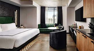 Take in sweeping views of Austin’s lively entertainment district from within this room on a higher floor. Discover impressive architectural design, plush green seating, soft gray rugs, and black-and-white terrazzo flooring.
