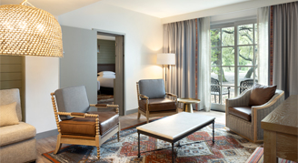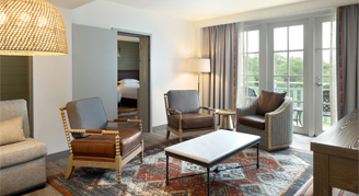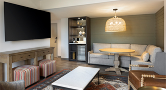 Feel at home in the Hill Country Suite, featuring a private king bedroom and a separate living area with a full-size sleeper sofa and dining table.