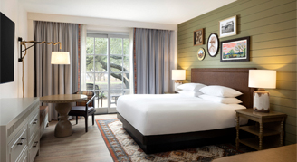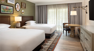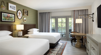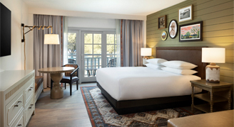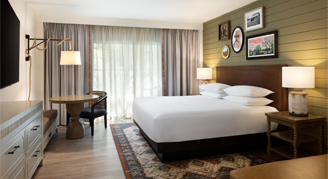 Enjoy extra space and preferred ground-floor access in this Preferred Hill Country Suite with Patio featuring a private king bedroom and separate living area with a full-size sleeper sofa and a dining table. This patio suite provides direct access to the playground, pools, and outdoor amenities.