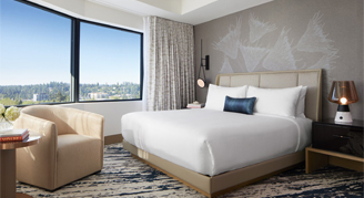 Located on the 7th floor or higher, rooms feature one king bed, a sitting area, desk, and views of the city and Pacific Northwest scenery. Additional amenities include robes and slippers, an Illy coffee maker, and a mini-bar.