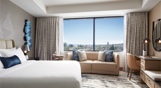 Located on the 7th floor or higher in a corner unit, rooms feature one king bed, a sitting area, desk, a separate bathtub and shower and additional windows with views of the city and Pacific Northwest scenery. Additional amenities include robes and slippers, an Illy coffee maker, and a mini-bar.