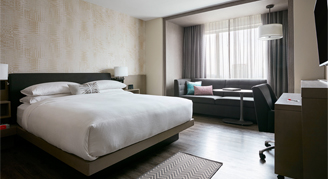 Rooms are located on higher floors and feature one king bed, a desk and a sitting area with a pull-out sofa.