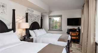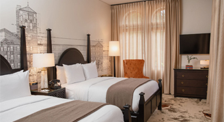 Rooms feature two queen beds, a work desk and chair, a bathroom with a sleek glass shower, and views of the surrounding park. Additional amenities include historic vaulted ceilings, enhanced coffee service with additional Nespresso flavors and creamers, and eucalyptus shower steamers.