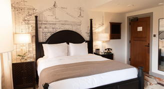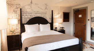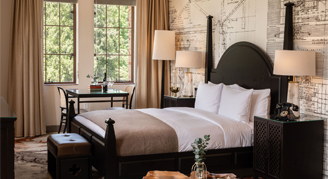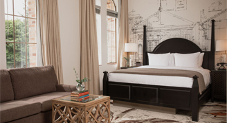 Rooms feature one king bed, a work desk and chair, a seating area with a pull-out sofa, a bathroom with an accessible tub, and views of the surrounding park. Additional amenities include historic vaulted ceilings, enhanced coffee service with additional Nespresso flavors and creamers, and eucalyptus shower steamers.