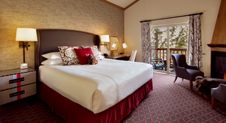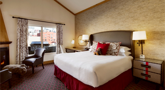 Rooms feature one king bed, a desk, seating area with a fireplace, and limited views