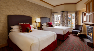 Suites feature two double beds, a desk, living area with a pull-out sofa and fireplace, and views of the city.