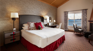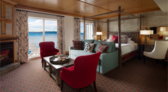 Suites feature one king bed, a desk, sitting area with a pull-out sofa and fireplace, and balcony furnished with Adirondack chairs and panoramic views of Elliott Bay.